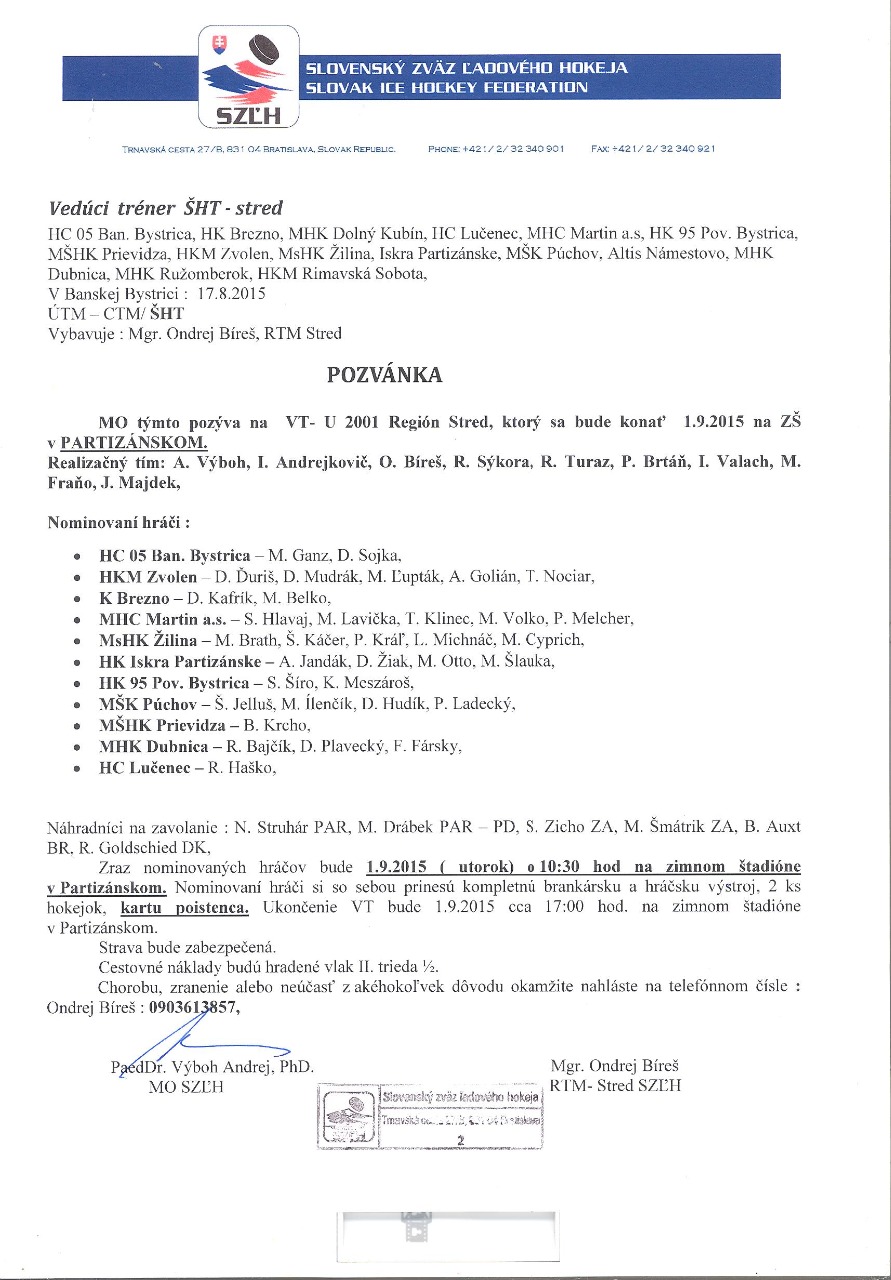 Pozvánka na výber do SR 15 región stred 19.08.2015 14:18 Za náš klub boli nominovaní hráči: Plavecký Dominik, Bajčík Richard, Farský Filip.